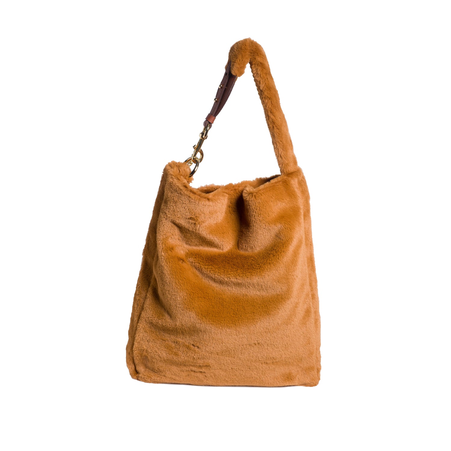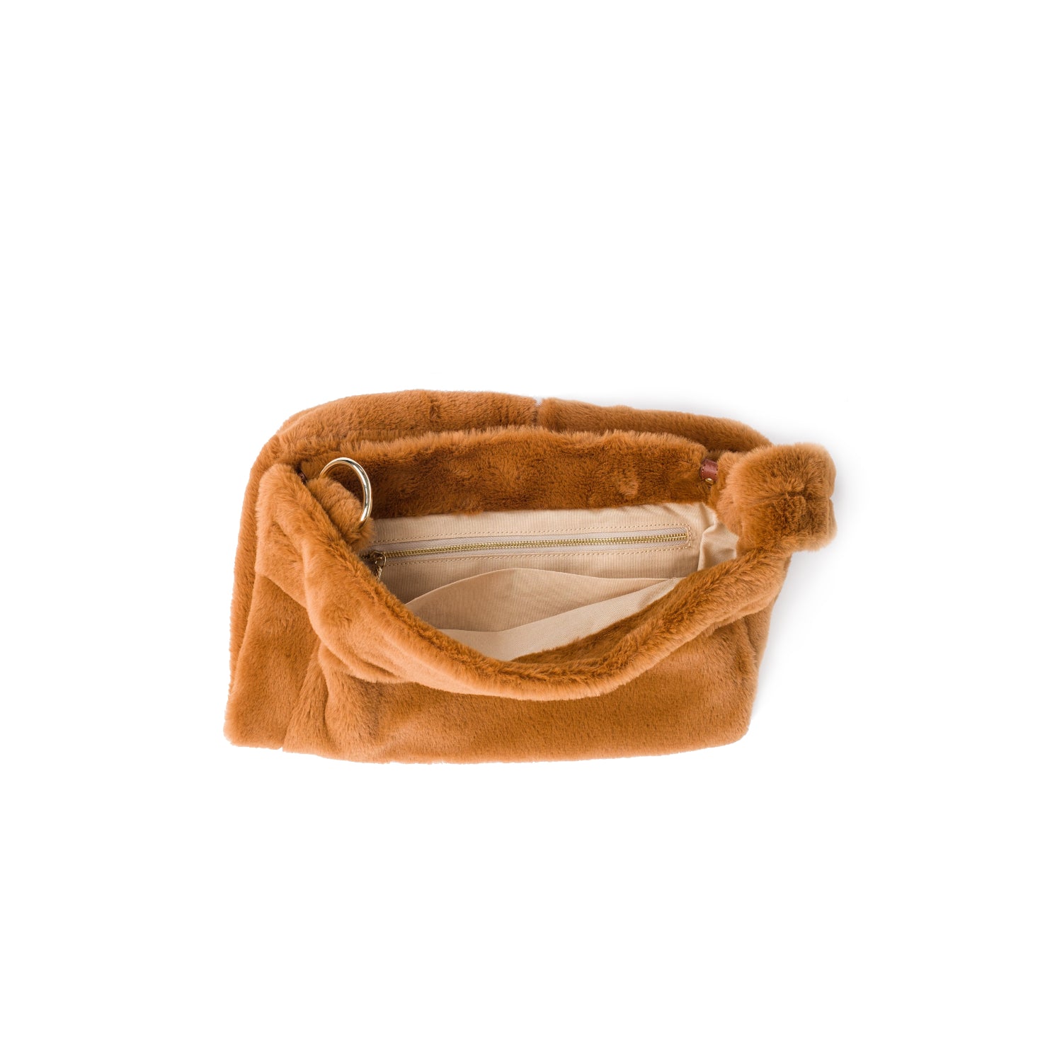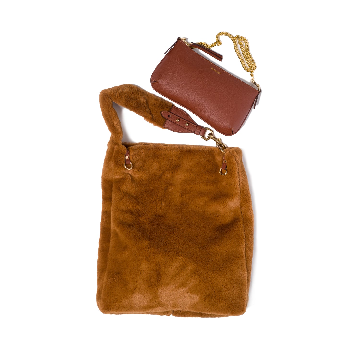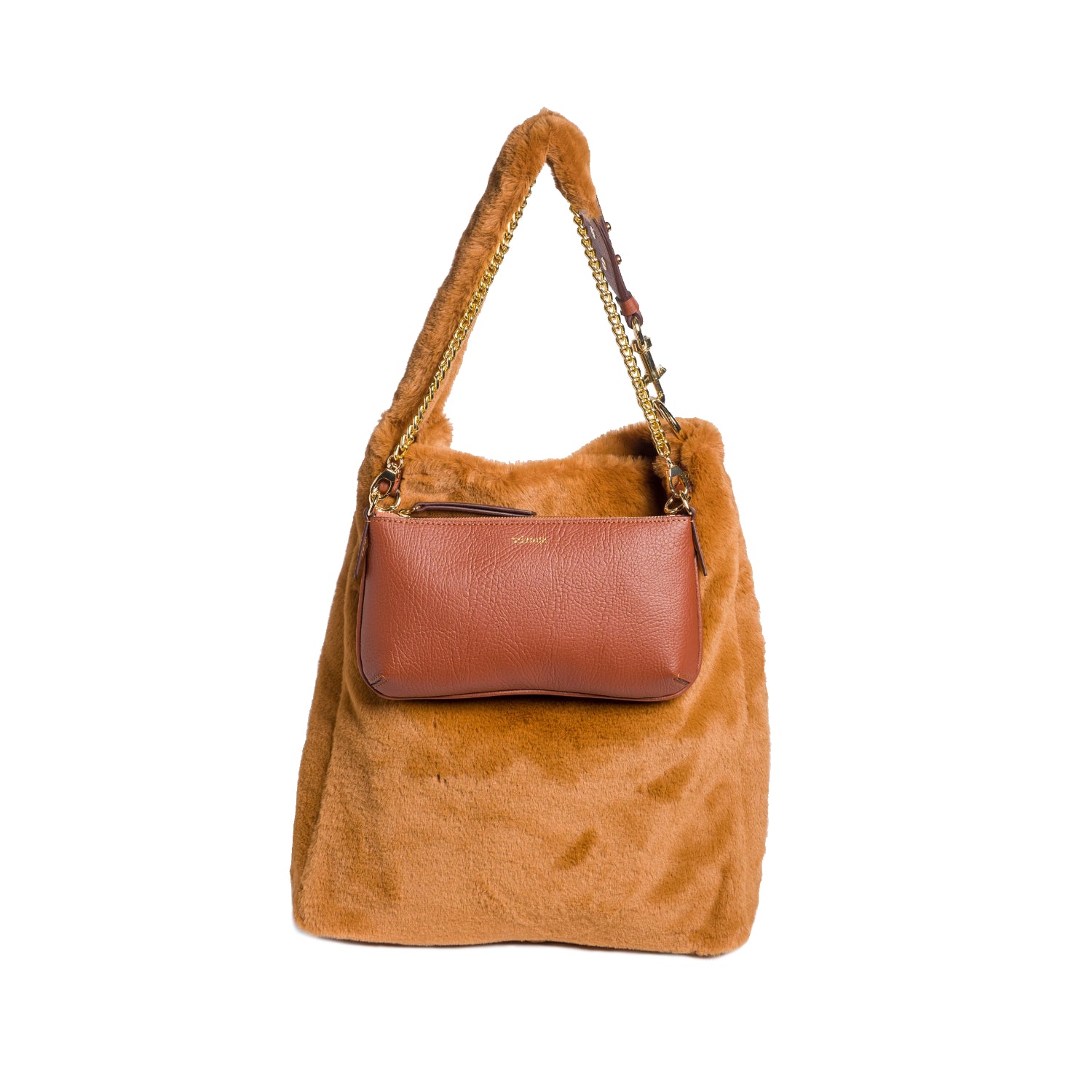 Our versatile shoulder bag is made of two separate detachable bags. The large fur bag can even fit you laptop inside. Contains a zipper pocket and a phone sleeve. The small bag is detachable, and contains inside a zipper pocket as well.