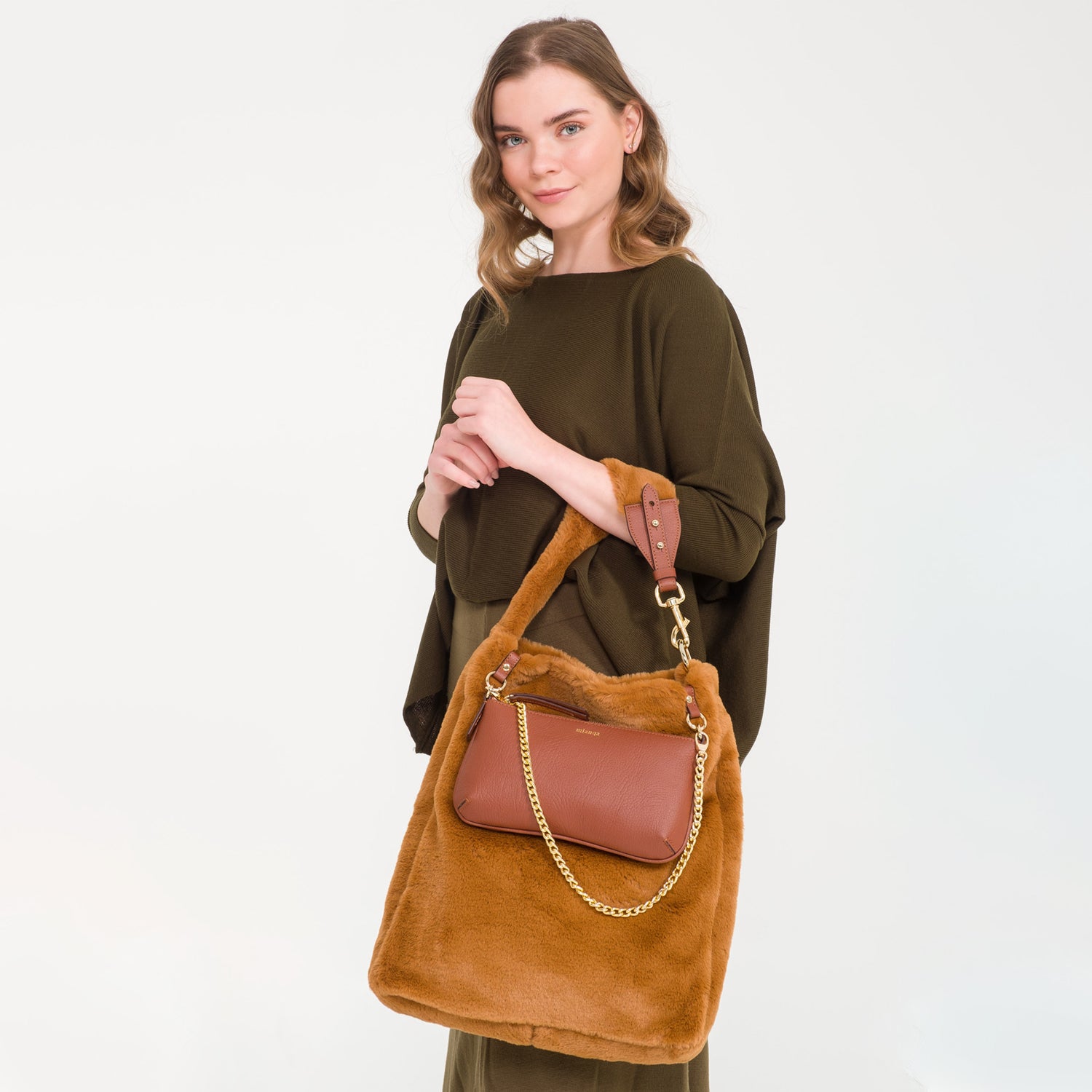 Made of vegan apple leather and soft faux fur. Apple leather is a sustainable vegan leather, produced by using fibres derived as residuals from the industrial processing of apples. This plant-based leather alternative patented by Frumat is made in Italy.