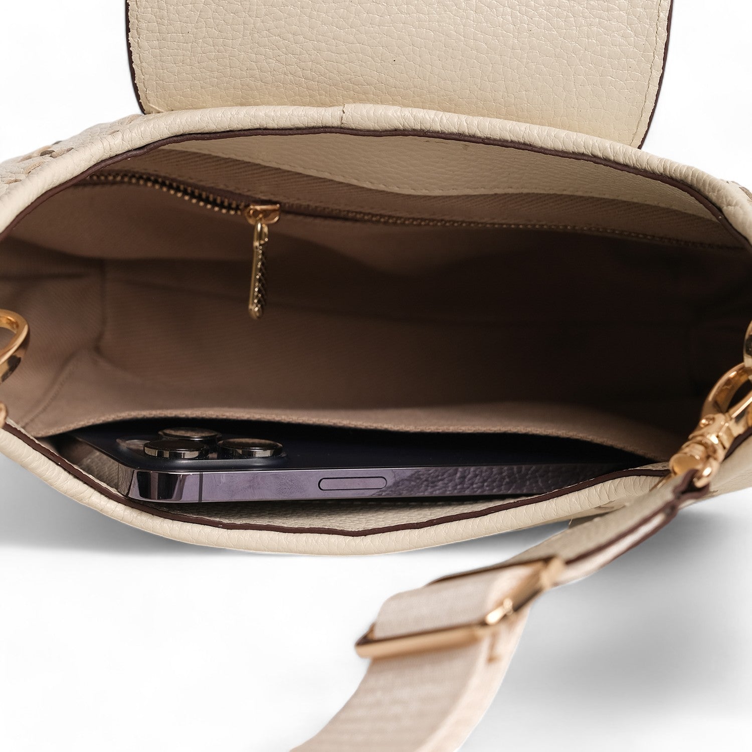 Expertly crafted with upcycled leather, the Anqa Moon Shoulder Bag features a unique moon shape and handwoven body. With an additional and adjustable size crossbody webbing, it offers versatility and convenience. Keep your belongings organized with the inside zipper pocket and phone sleeve. Inside is lined with recycled polyester.