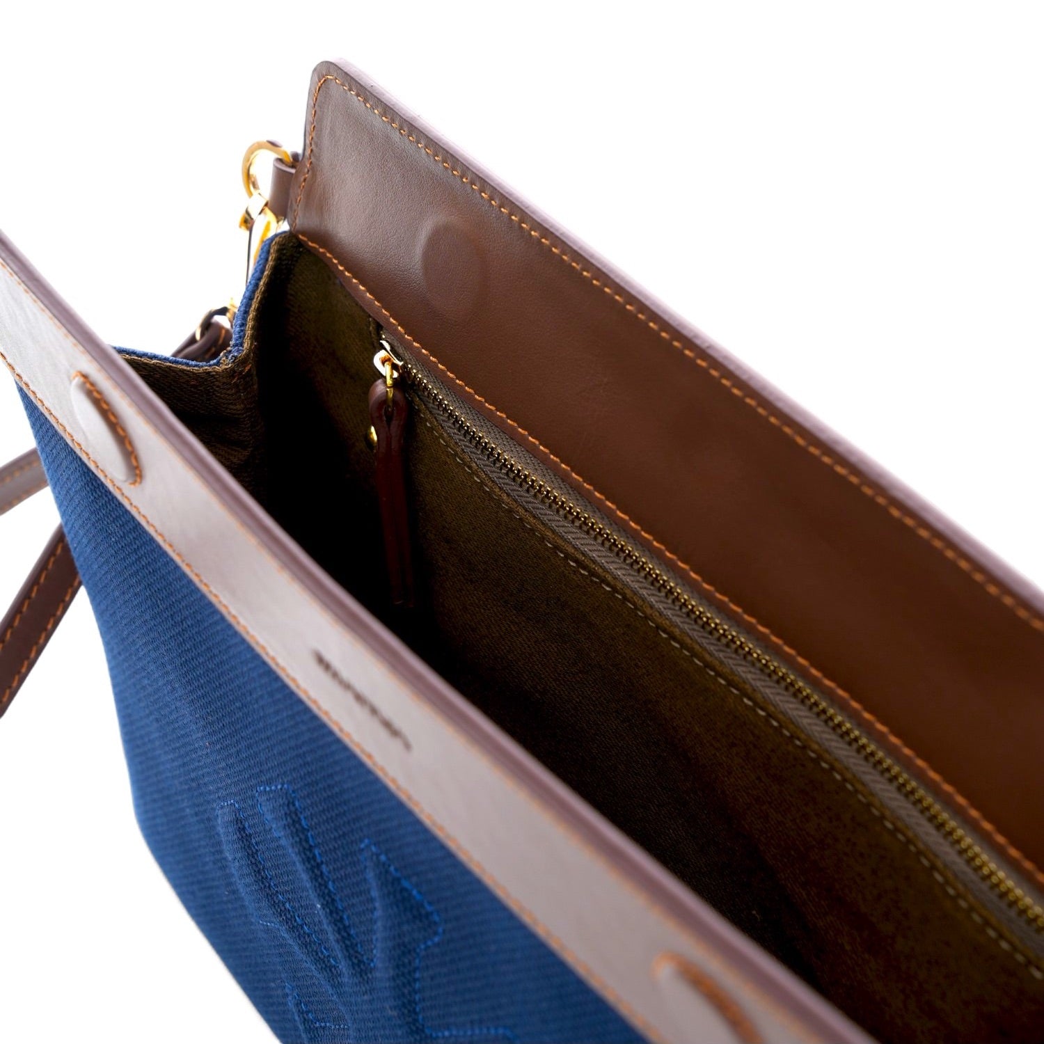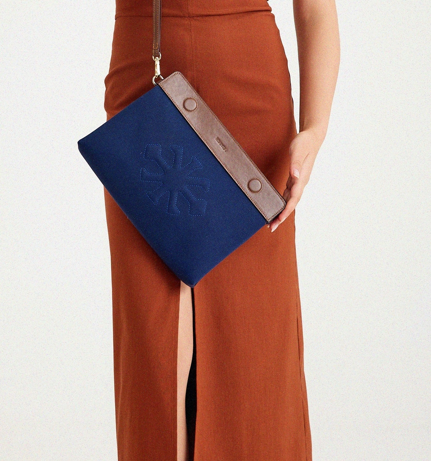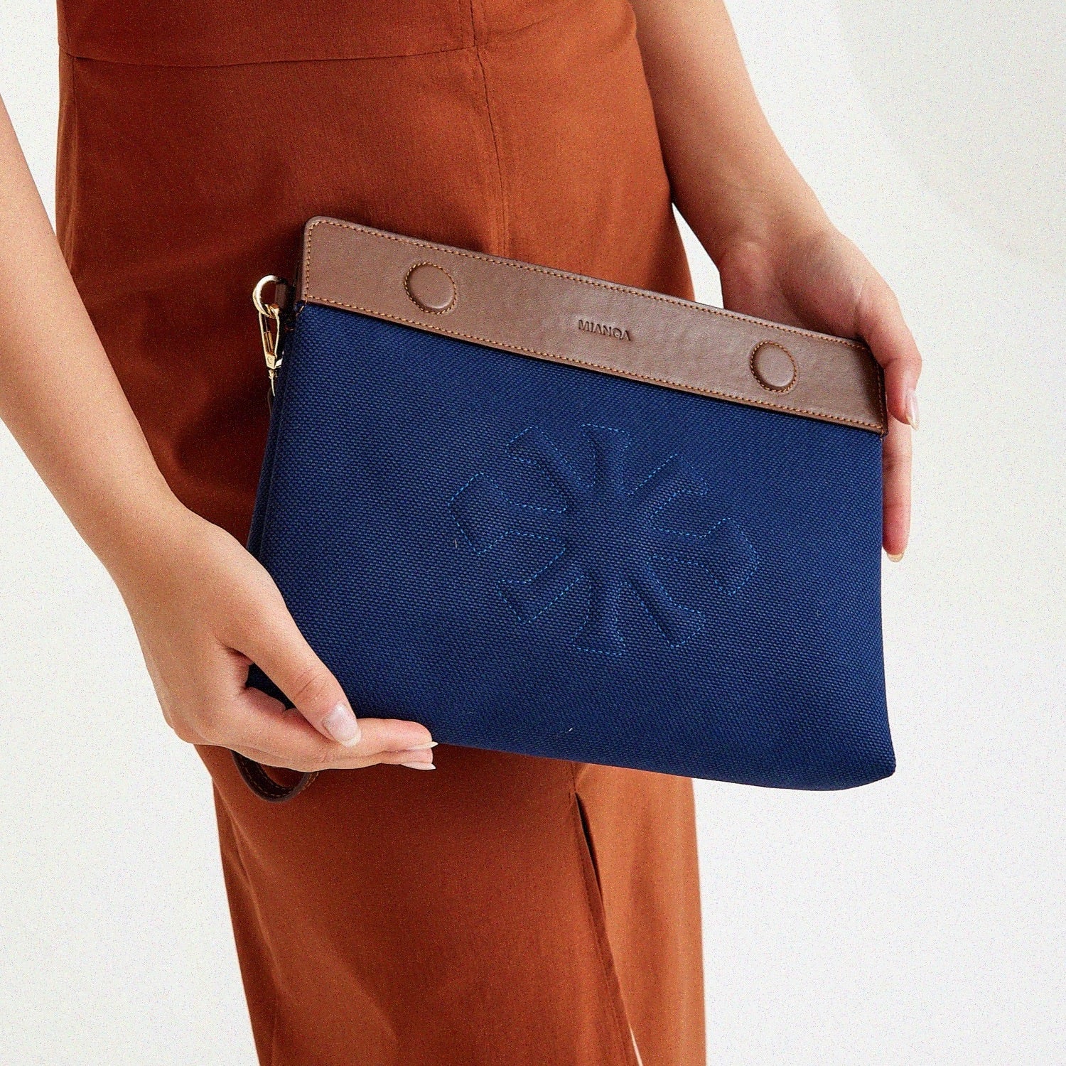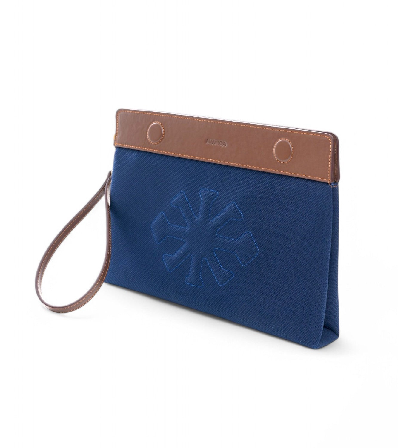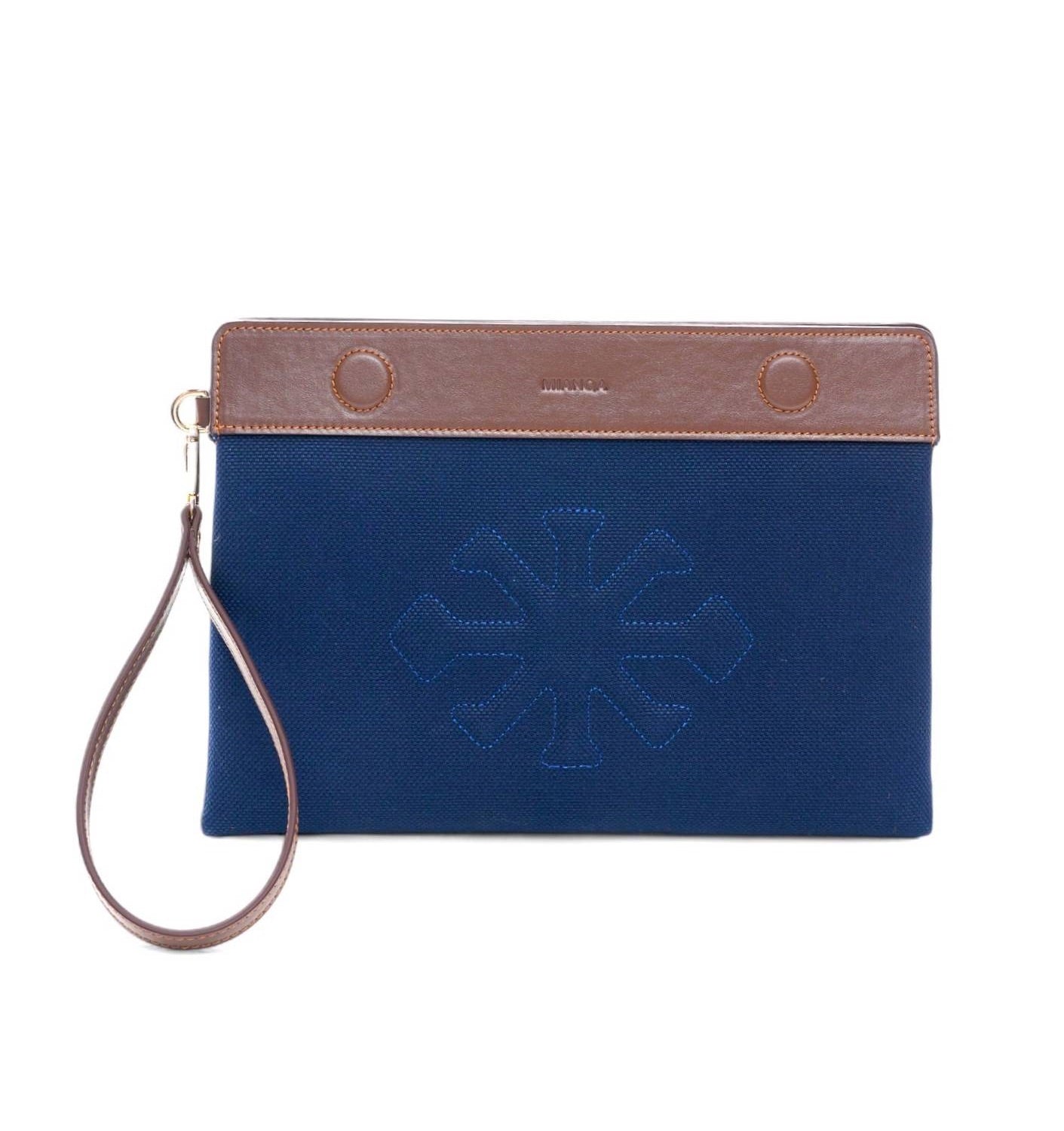 Designed with modern details, our clutch is made of water repellent cotton canvas fabrics and garnished with finest quality genuine leather. The inside is lined with a fabric recycled from pet bottles. Contains a zipper pocket and a phone sleeve inside.