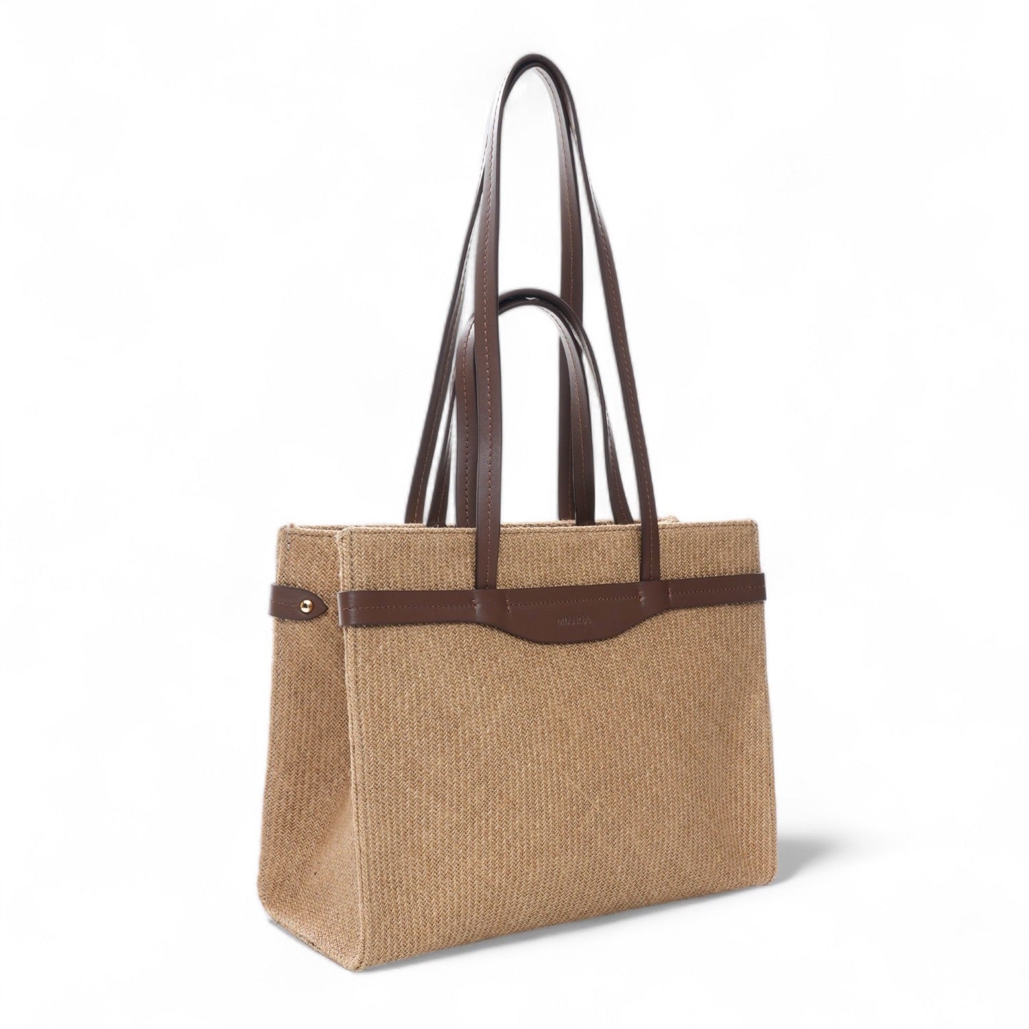 Designed with modern details, our fabric totes are made of 100% biodegradable jute fabric and are garnished with finest quality genuine leather. Comes with ideal length long straps for a comfortable wear on shoulder and two short straps to carry by hand. The inside is lined with a fabric recycled from pet bottles.