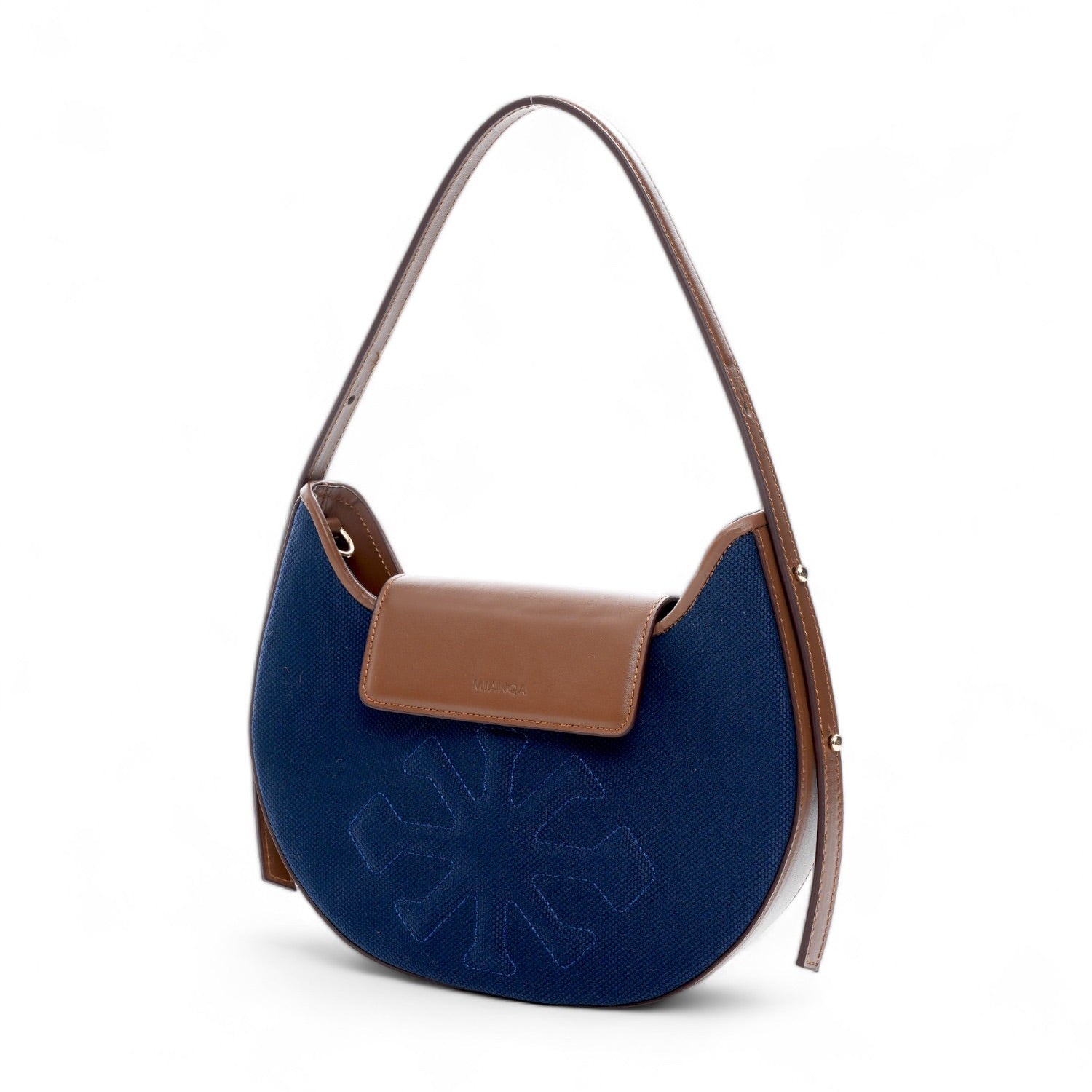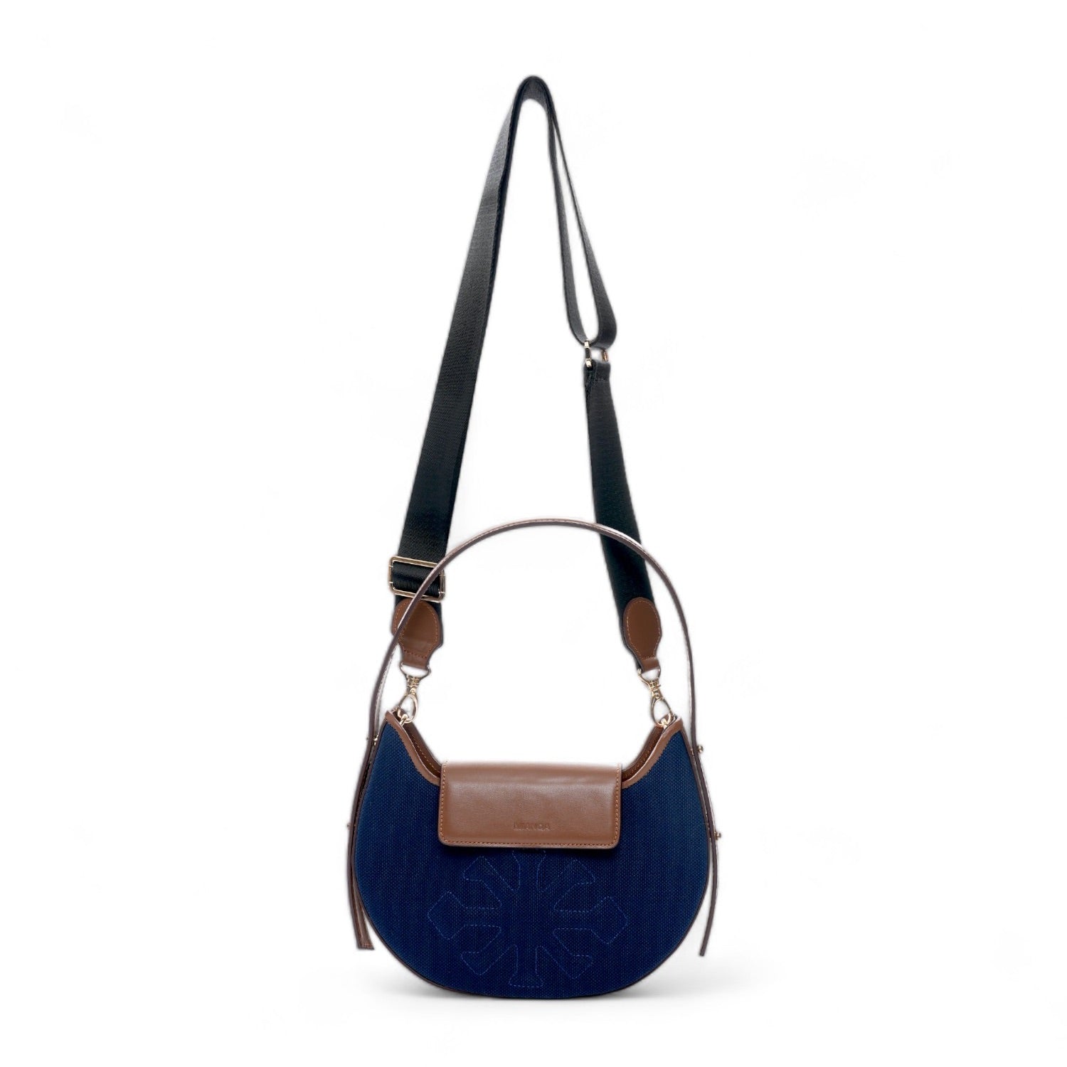 Designed with modern details, our small shoulder bag is made of water repellent cotton canvas fabrics and garnished with finest quality genuine leather. Comes with an additional adjustable cotton webbing strap, for wearing crossbody. The inside is lined with a fabric recycled from pet bottles. Contains a zipper pocket and a phone sleeve inside.