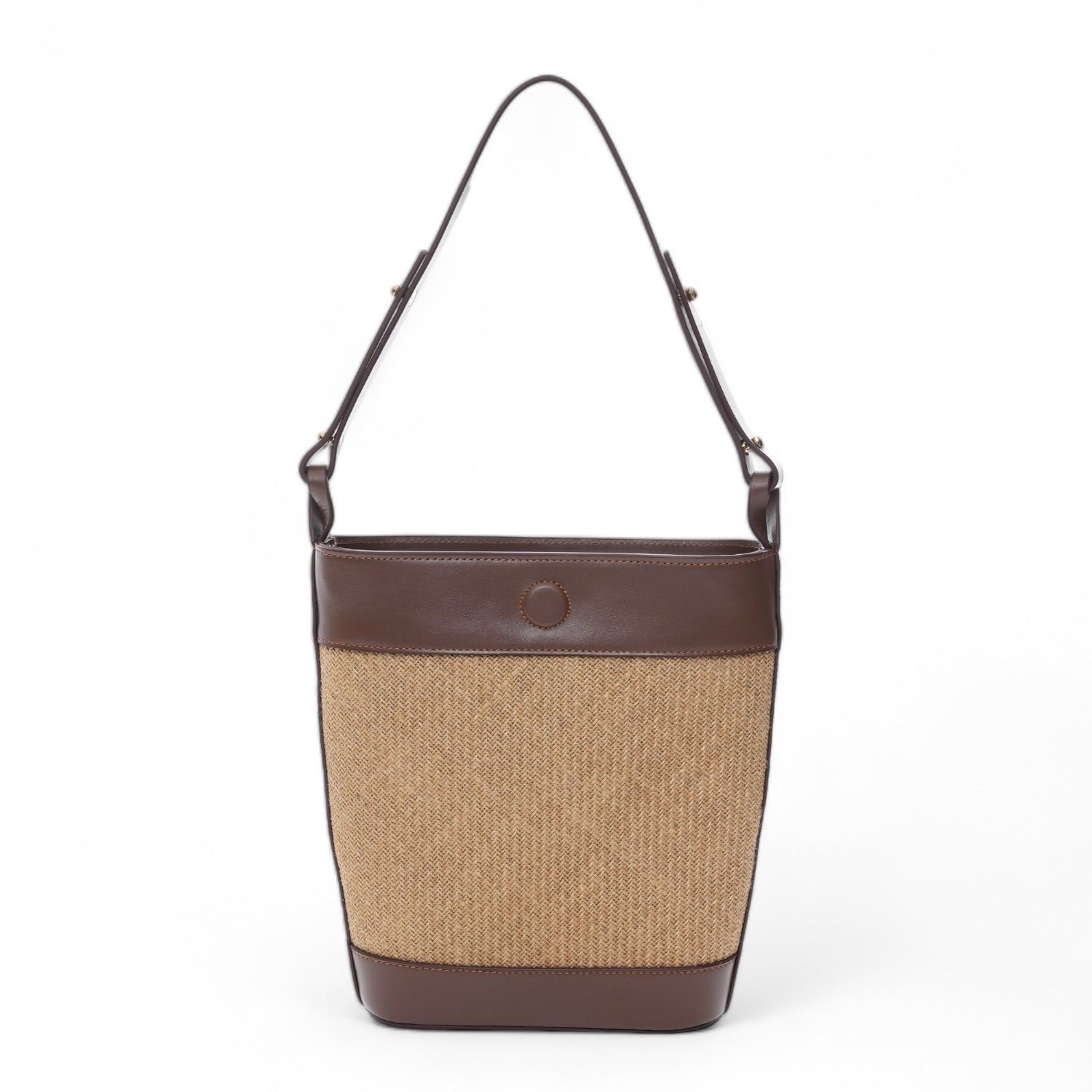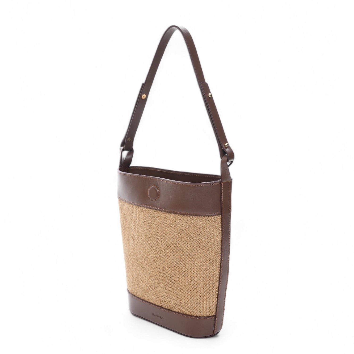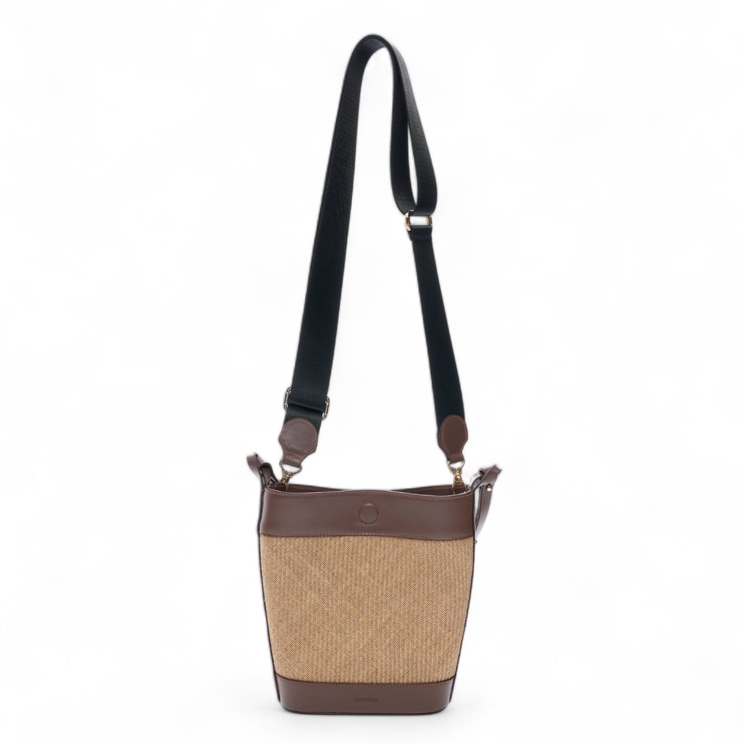 Designed with modern details, our bucket shaped small shoulder bag is made of 100% biodegradable jute fabric and is garnished with finest quality genuine leather. Comes with an additional adjustable cotton webbing strap, for wearing crossbody. The inside is lined with a fabric recycled from pet bottles. Contains a zipper pocket and a phone sleeve inside.