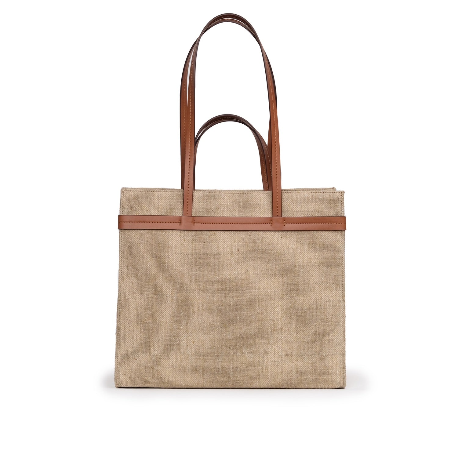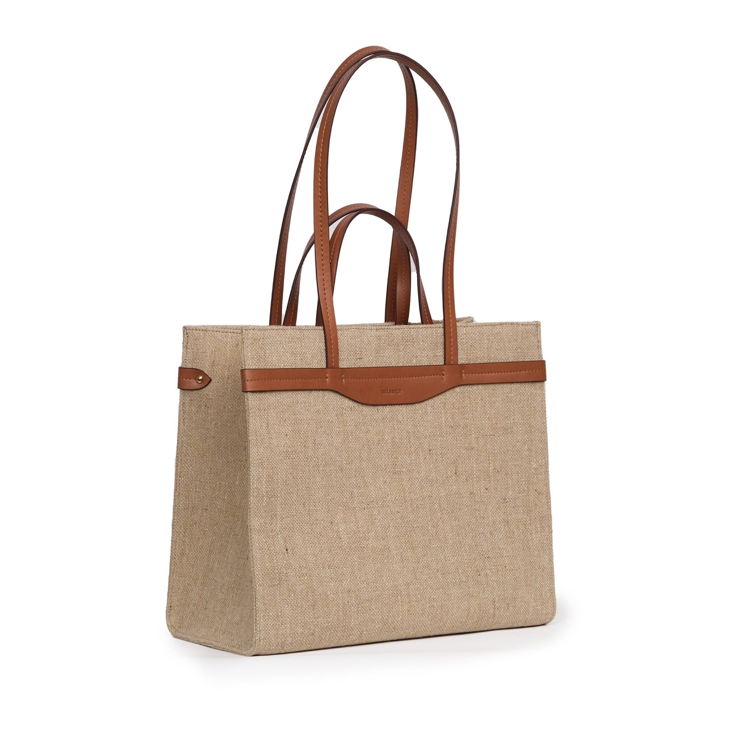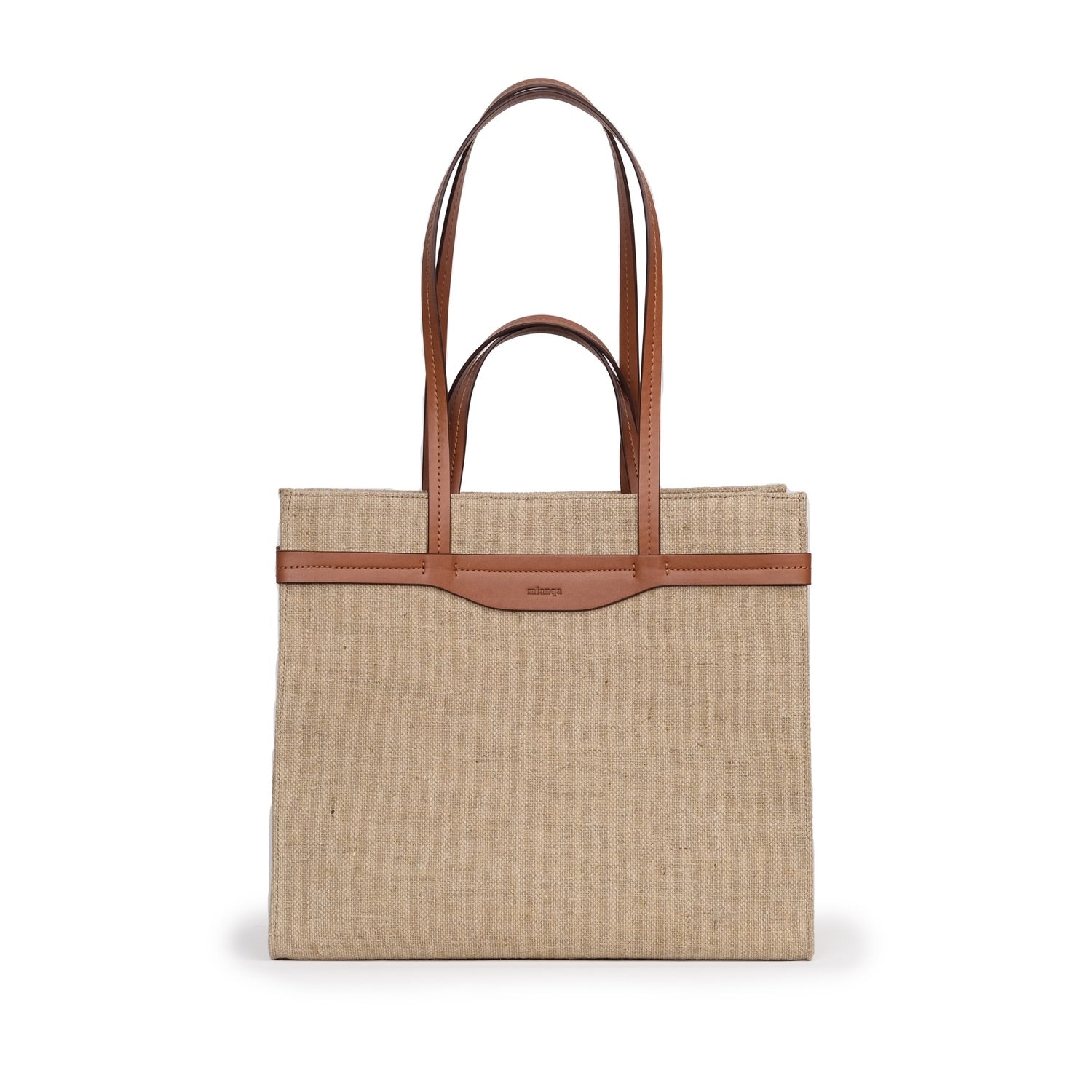 Designed with modern details, our fabric totes are made of deadstock fabrics and vegan apple leather. Apple Leather is an animal free and plant-based leather alternative, produced using fibres derived as residuals from the industrial processing of apples. Comes with ideal length long straps for a comfortable wear on shoulder and two short straps to carry by hand. The inside is lined with a fabric recycled from pet bottles.