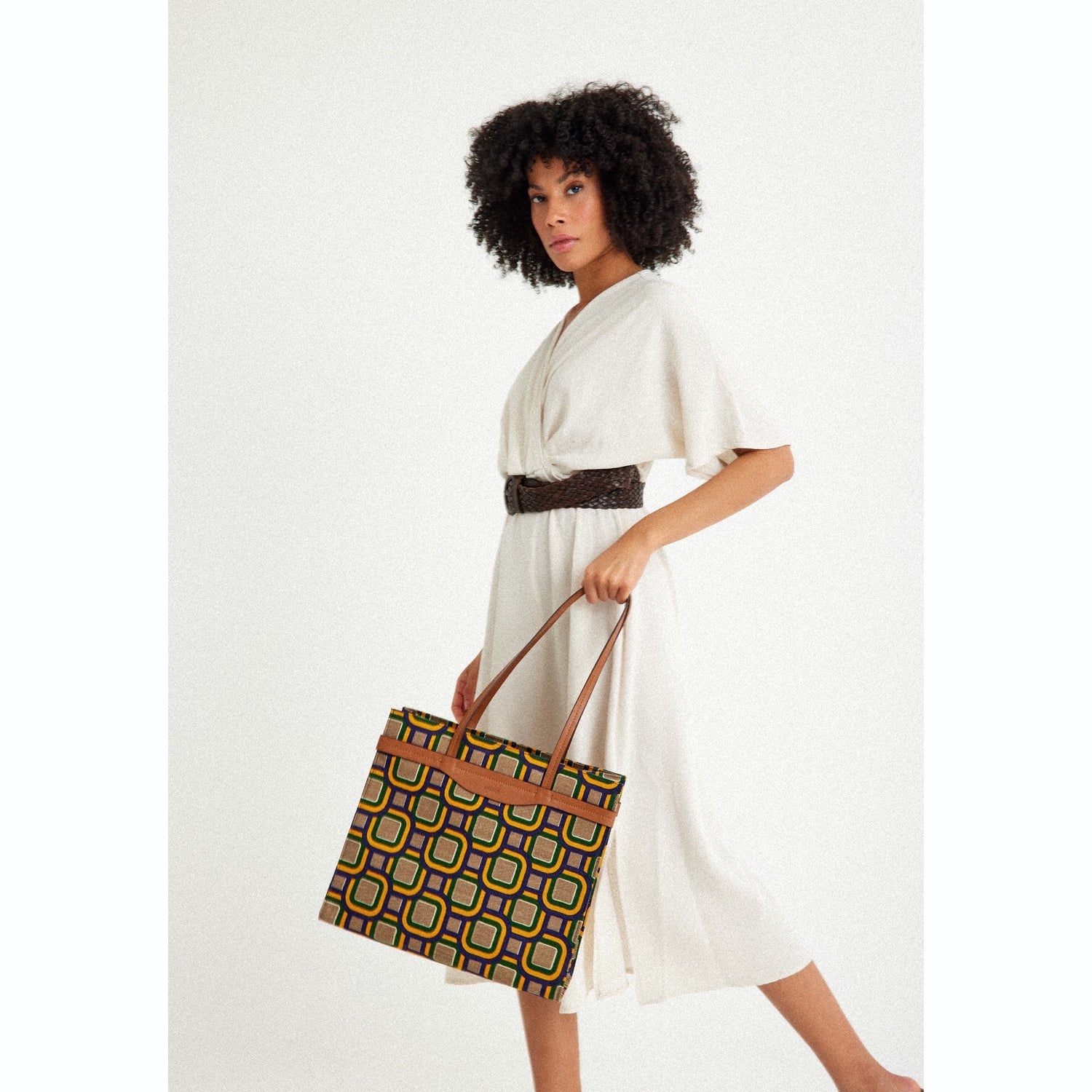 Designed with modern details, our fabric totes are made of deadstock fabrics and vegan apple leather. Apple Leather is an animal free and plant-based leather alternative, produced using fibres derived as residuals from the industrial processing of apples. Comes with ideal length long straps for a comfortable wear on shoulder and two short straps to carry by hand. The inside is lined with a fabric recycled from pet bottles.