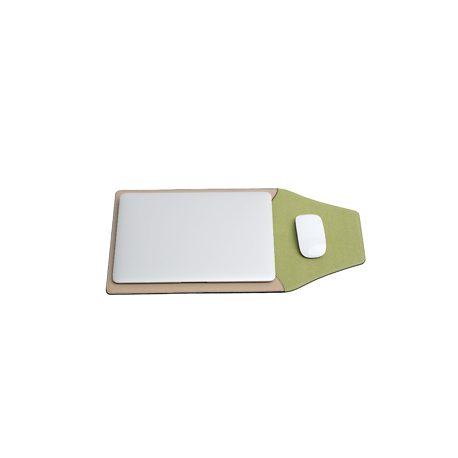 Our Laptop Sleeve is made of plant-based vegan apple leather, and contrasting colors of soft micro suede to accompany you for years to come. Designed to use also as a leather pad for underneath your laptop at home or office.